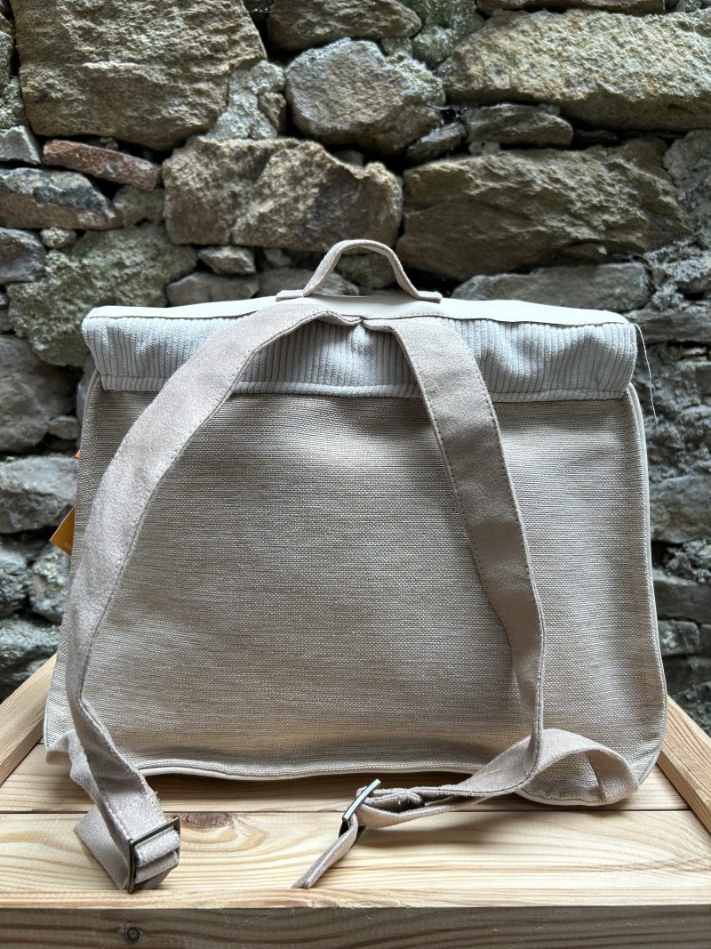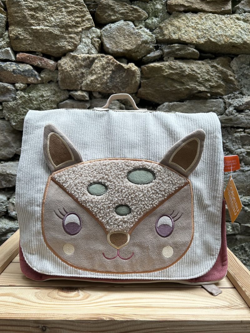 Ce joli cartable pour enfants est confectionné avec des tissus français. Le velours cÎtelé du rabat apporte douceur et qualité, et les renforts en similicuir assurent la tenue !