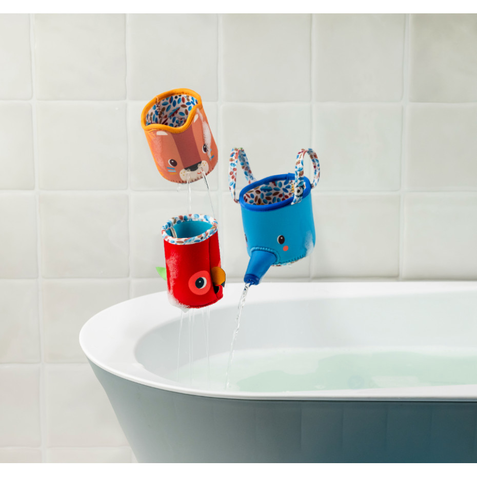 Ensuite, c’est au tour de l’éléphant : en l’attrapant par ses grandes oreilles rigolotes, qui servent aussi de poignées, il vous aspergera par sa trompe comme un arrosoir ! Enfin, Gilles le perroquet vous arrose sur la tête, grâce à ses ouvertures situées par dessous ! Ce jeu d’arrosage n’a pas fini d’attiser la curiosité de bébé, et de développer la motricité des bambins ! Votre enfant va adorer encastrer les gobelets et découvrir les différents jets d’eau.