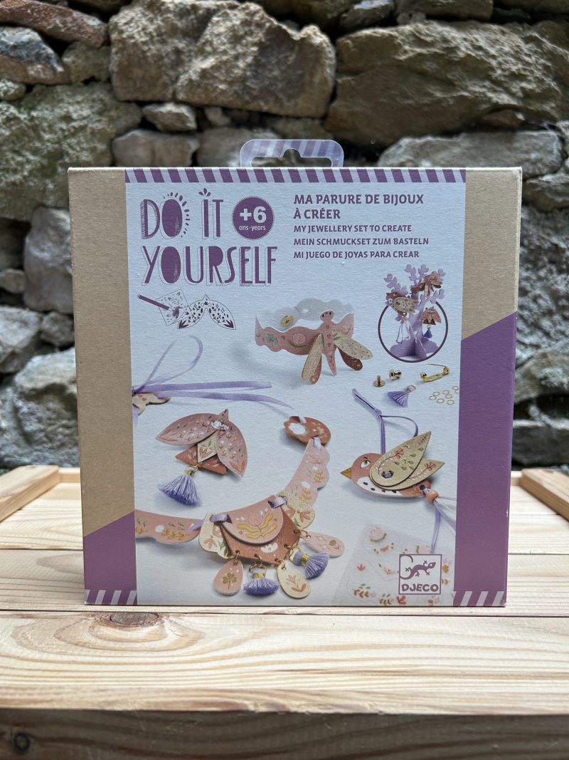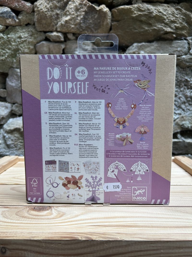 Un kit pour réaliser une parure en cuir synthétique, à l’intérieur il y a un collier, un bracelet, une broche et un bijou à cheveux.